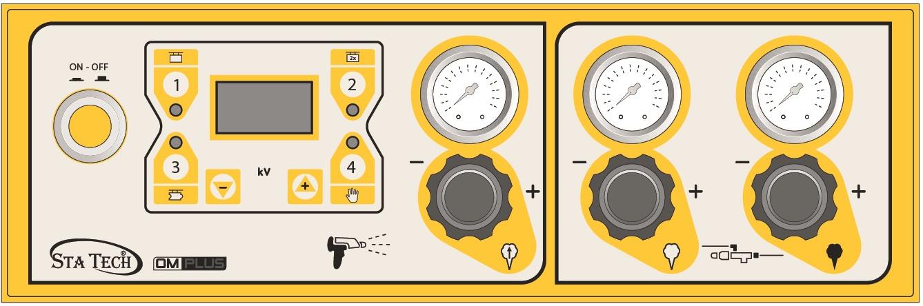 Yeni nesil Statech OM-PLUS modeli elektrostatik toz boya cihazımızda voltaj ayarı dijital olarak kontrol edilmektedir. 4 program hafızası ile sizlere sunulan yeni nesil cihazımız daha yüksek performans sağlar. 1. program sıfır boyasız ürün boyaması 100kV, 2. program boyalı malzeme ikinci kat boyaması 20kV, 3. program köşe diplerin boyanması 50kV, 4. program ise boş bırakılarak operatörün kendine has bir ayar tanımlanması amaçlanmıştır.